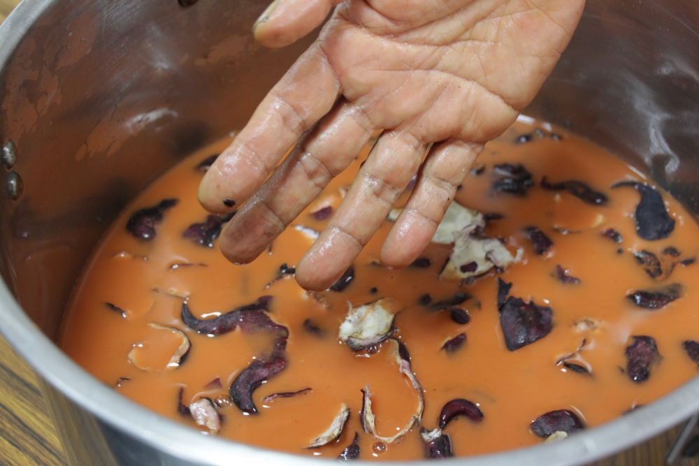 官田,菱角的故鄉,我們進入東西庄社區,居民不是種植菱角,就是從事跟菱角相關的行業,每個人心中都有一段菱角的故事,各個都是長長的詩篇。我們嘗試以天然染色切入社區研究,期望讓農廢物「菱角殼」能再度被利用。不料,近年來公所推行菱角炭,大量收集菱角殼去燒製菱角炭,也有部分積極推動有機種植的農戶,可以以較高價錢賣給有機商店做菱角茶,據說可以解毒。一時之間我們竟然收集不到「農廢物」,一則以喜一則以憂,喜則是農廢物受到廣大重視,憂則是如果沒有材料,我們該如何進行研究。